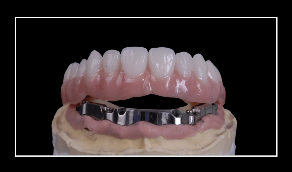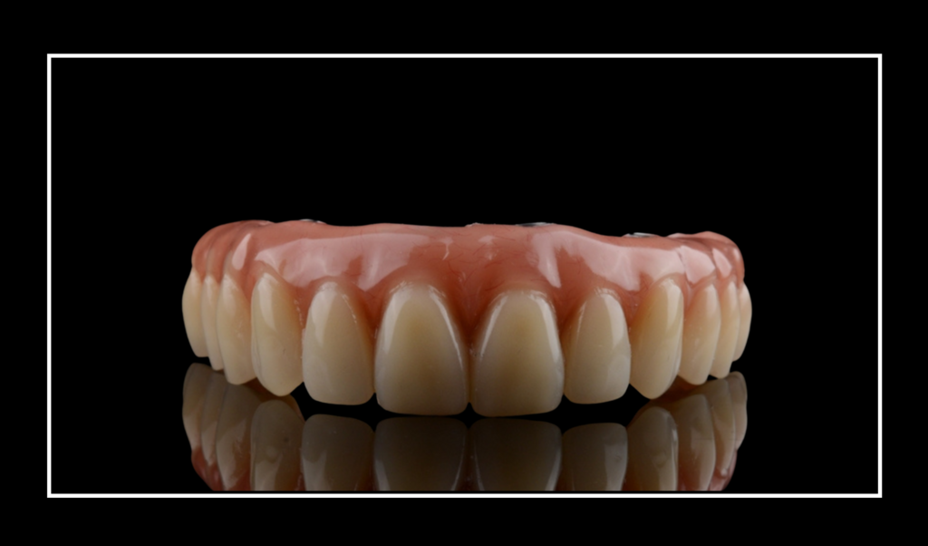 Our Acrylic Hybrid restorations are designed for full-arch implant-supported solutions where long-term durability and esthetics matter. Seated on a custom-milled titanium bar or direct-to-MUA abutments, this prosthesis combines the stability of fixed implant support with the lifelike esthetics of high-quality denture acrylic and premium teeth.